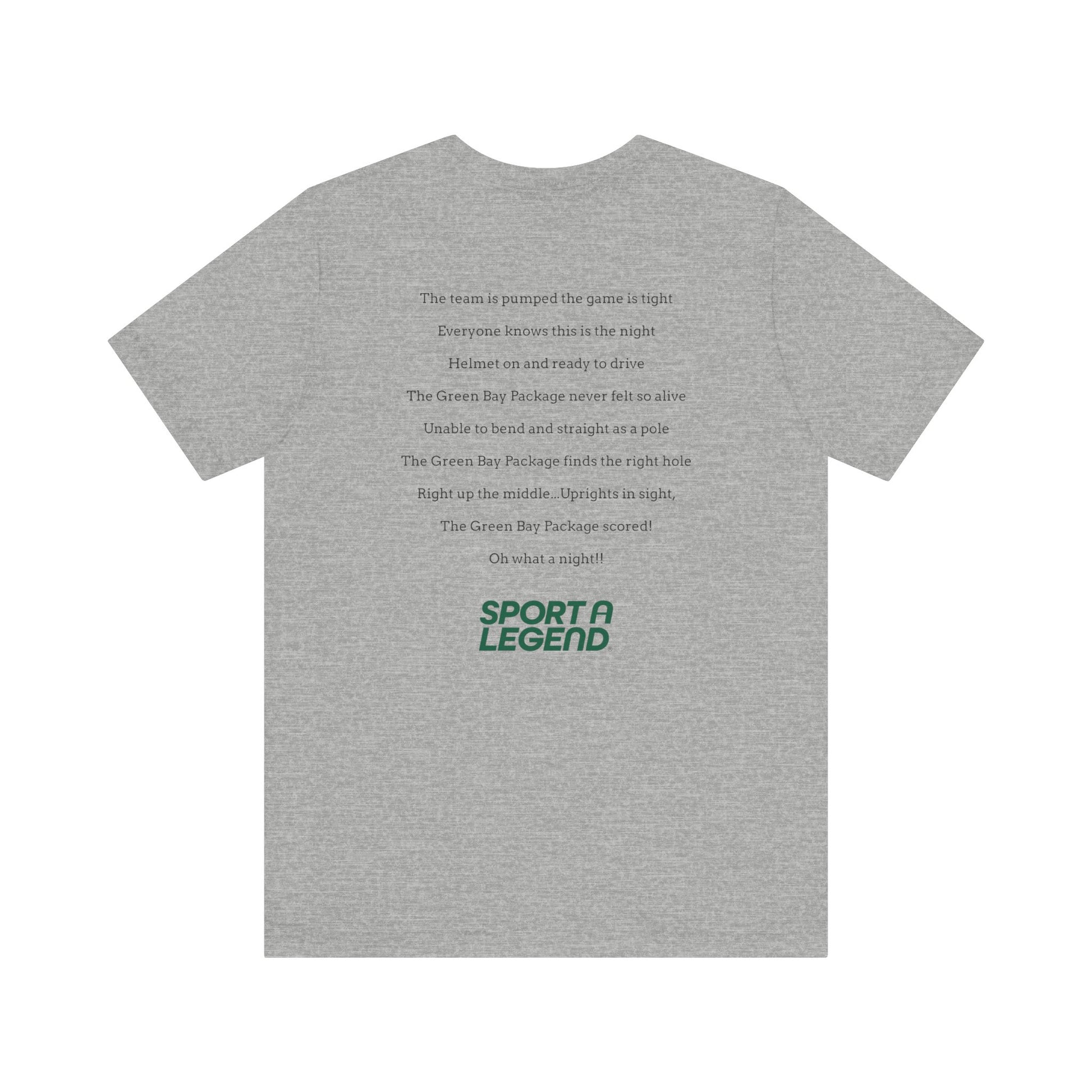 BACK PRINT The team is pumped the game is tight. Everyone knows this is the night. Helmet on and ready to drive. The Green Bay Package never felt so alive. Unable to bend and straight as a pole. The Green Bay Package finds the right hole. Right up the middle...Uprights in sight, The Green Bay Package scored! Oh what a night!!