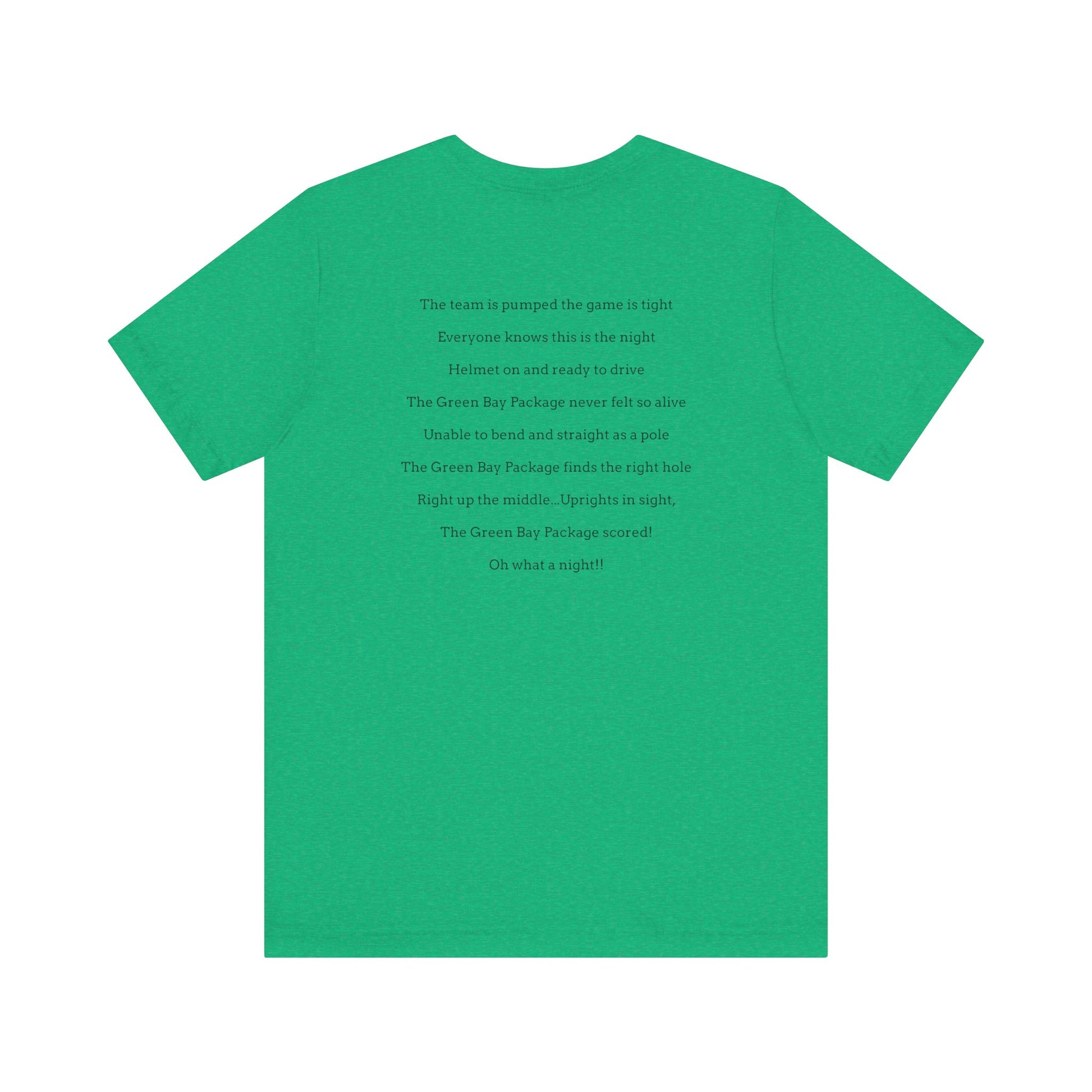 BACK PRINT The team is pumped the game is tight. Everyone knows this is the night. Helmet on and ready to drive. The Green Bay Package never felt so alive. Unable to bend and straight as a pole. The Green Bay Package finds the right hole. Right up the middle...Uprights in sight, The Green Bay Package scored! Oh what a night!!