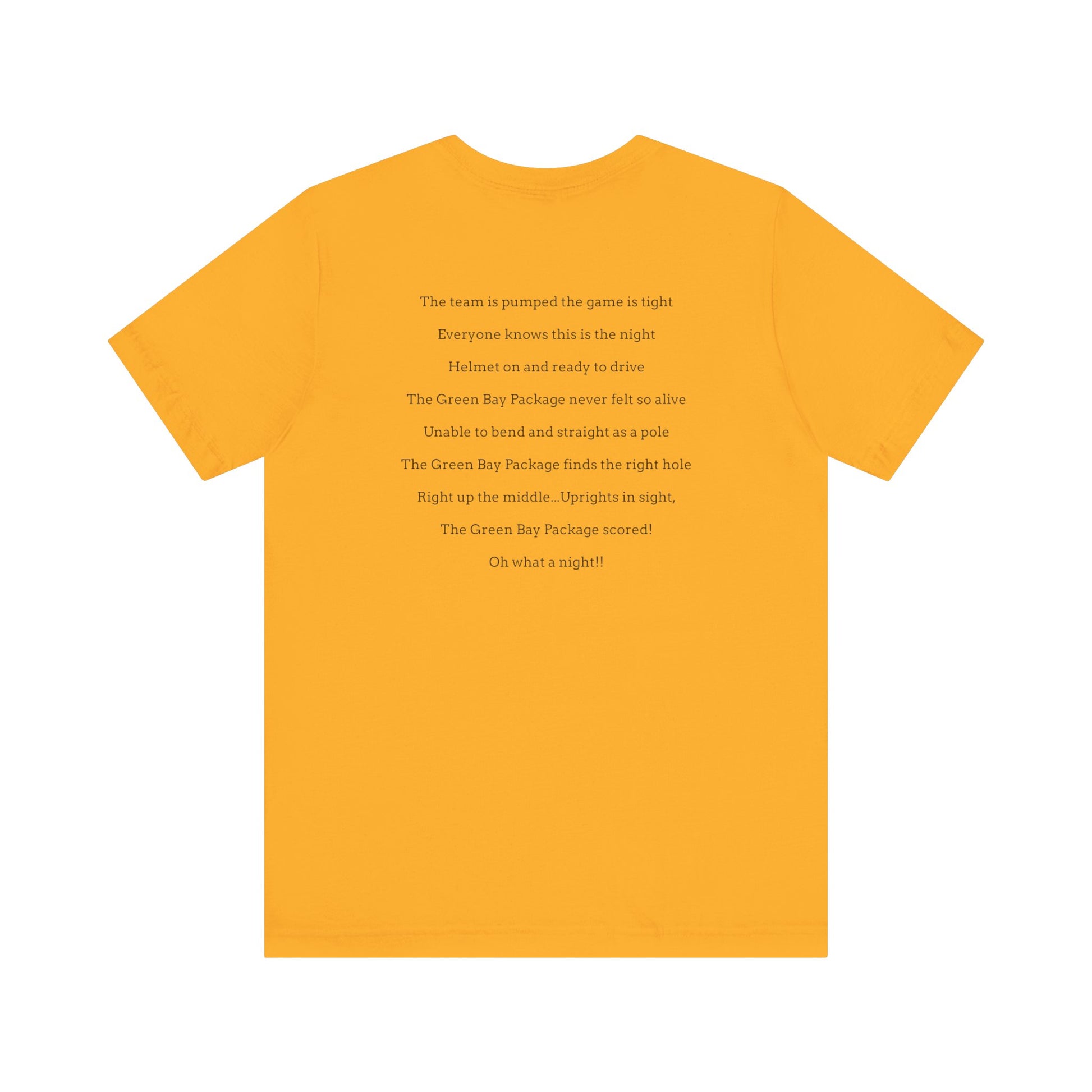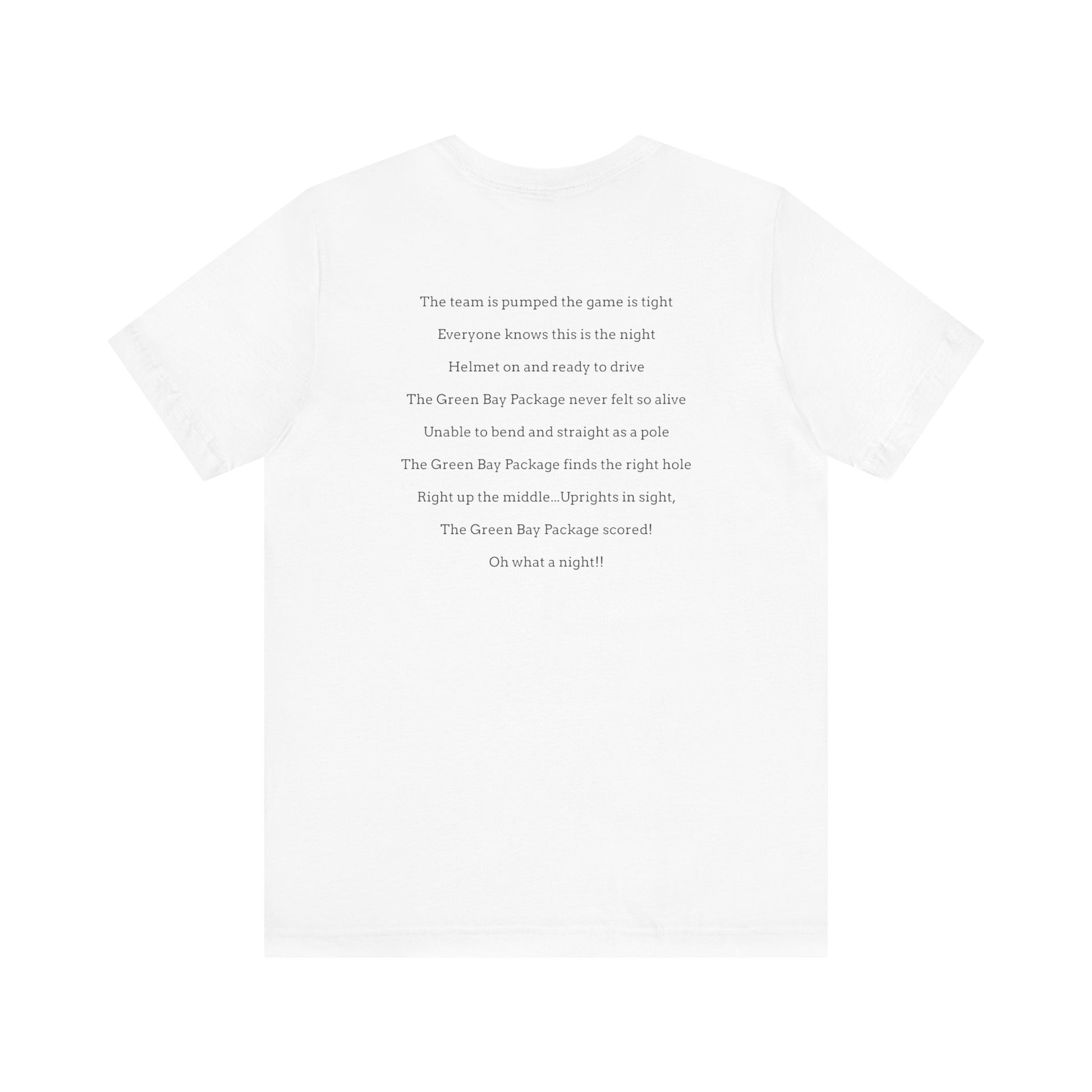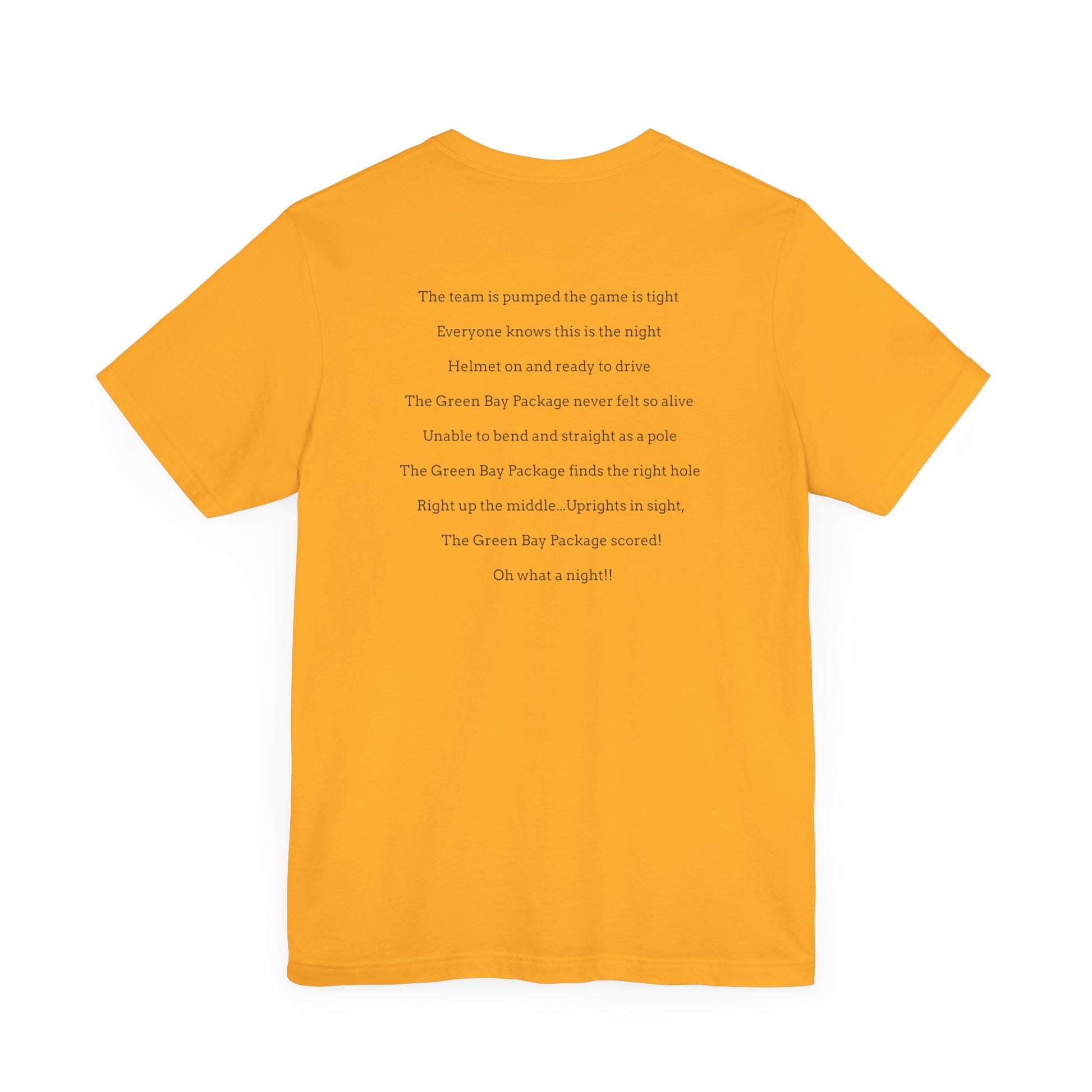 BACK PRINT The team is pumped the game is tight. Everyone knows this is the night. Helmet on and ready to drive. The Green Bay Package never felt so alive. Unable to bend and straight as a pole. The Green Bay Package finds the right hole. Right up the middle...Uprights in sight, The Green Bay Package scored! Oh what a night!!